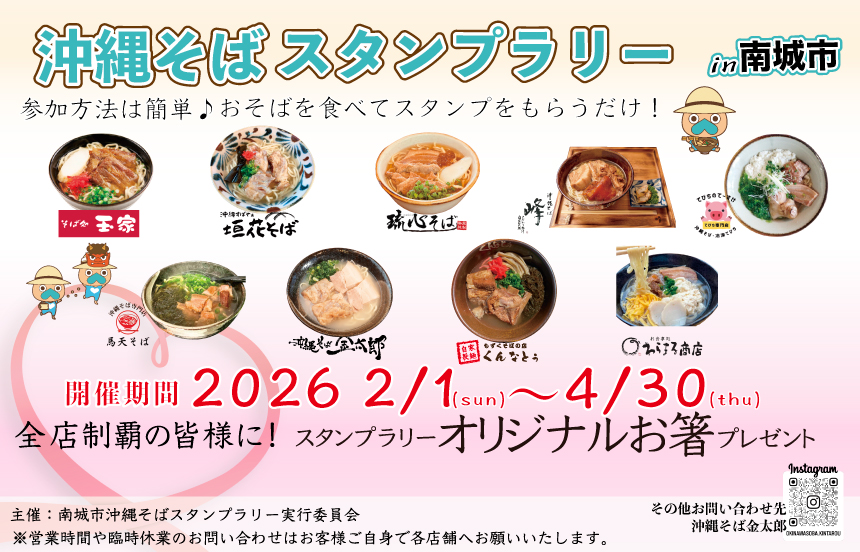 【免責事項】当Webサイトに掲載しているスタンプラリー情報は主催者の提供する情報をもとにしており、当協会において内容を保証するものではございません。掲載内容の不備による損害等については責任を負いかねます。また当Webサイトに掲載の情報やURLは予告なしに変更または中止されることがあります。「沖縄そばスタンプラリー in南城市」に関するお問い合わせは、当協会ではなく開催団体までお願いいたします。
