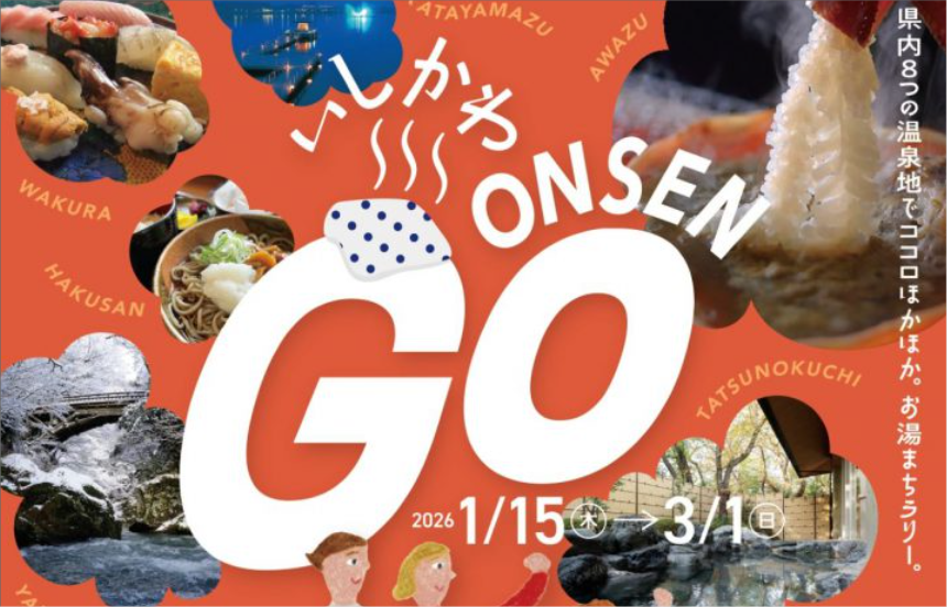 【免責事項】当Webサイトに掲載しているスタンプラリー情報は主催者の提供する情報をもとにしており、当協会において内容を保証するものではございません。掲載内容の不備による損害等については責任を負いかねます。また当Webサイトに掲載の情報やURLは予告なしに変更または中止されることがあります。「冬の温泉まちめぐり 「いしかわ ONSEN GO」デジタルスタンプラリー」に関するお問い合わせは、当協会ではなく開催団体までお願いいたします。