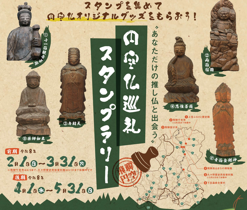 岐阜県内の14市町で構成する「円空連合」の事業として、高山市・下呂市で円空仏を公開する6施設を訪問していただき、円空上人の普及と加盟市町の活性化に資することを目的として「円空仏巡礼スタンプラリー」を実施します。