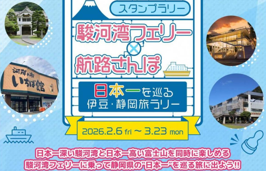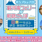 【免責事項】当Webサイトに掲載しているスタンプラリー情報は主催者の提供する情報をもとにしており、当協会において内容を保証するものではございません。掲載内容の不備による損害等については責任を負いかねます。また当Webサイトに掲載の情報やURLは予告なしに変更または中止されることがあります。「駿河湾フェリー×航路さんぽ 日本一を巡る伊豆・静岡旅ラリー」に関するお問い合わせは、当協会ではなく開催団体までお願いいたします。