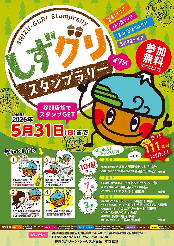 【免責事項】当Webサイトに掲載しているスタンプラリー情報は主催者の提供する情報をもとにしており、当協会において内容を保証するものではございません。掲載内容の不備による損害等については責任を負いかねます。また当Webサイトに掲載の情報やURLは予告なしに変更または中止されることがあります。「しずグリスタンプラリー」に関するお問い合わせは、当協会ではなく開催団体までお願いいたします。