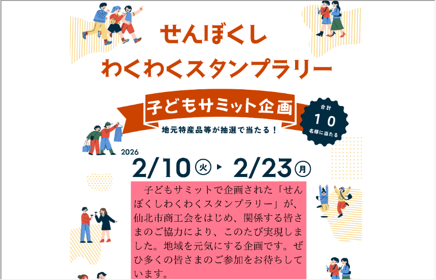 仙北市子どもサミットで企画された「せんぼくしわくわくスタンプラリー」が、仙北市商工会をはじめ、関係する皆さまのご協力により、このたび実現しました。子どもたちの思いが詰まった、地域を元気にする企画です。ぜひ多くの皆さまのご参加をお待ちしています。