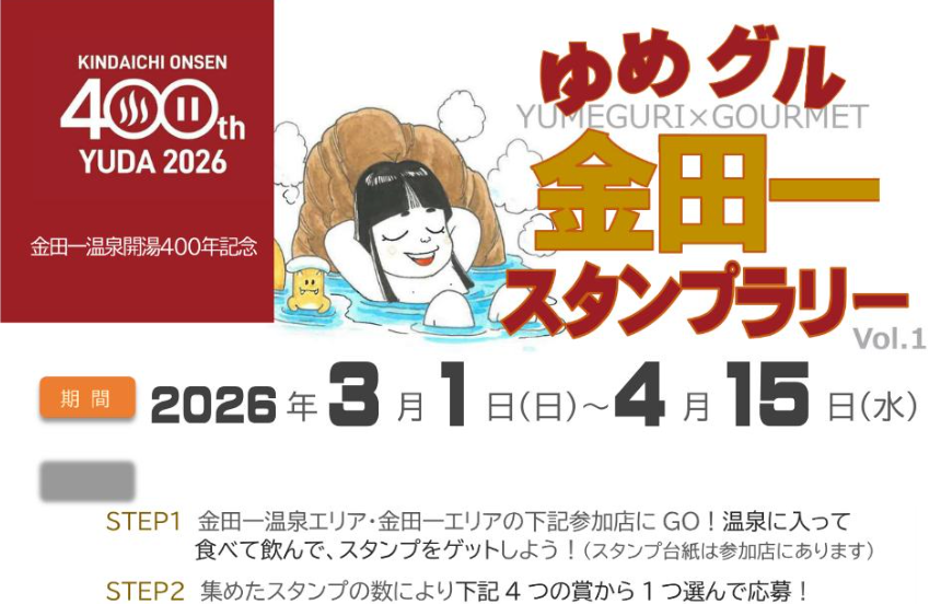 【免責事項】当Webサイトに掲載しているスタンプラリー情報は主催者の提供する情報をもとにしており、当協会において内容を保証するものではございません。掲載内容の不備による損害等については責任を負いかねます。また当Webサイトに掲載の情報やURLは予告なしに変更または中止されることがあります。「ゆめグル金田一 スタンプラリー Vol.1」に関するお問い合わせは、当協会ではなく開催団体までお願いいたします。