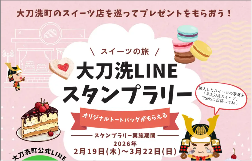 【免責事項】当Webサイトに掲載しているスタンプラリー情報は主催者の提供する情報をもとにしており、当協会において内容を保証するものではございません。掲載内容の不備による損害等については責任を負いかねます。また当Webサイトに掲載の情報やURLは予告なしに変更または中止されることがあります。「大刀洗LINEスタンプラリー(スイーツの旅)」に関するお問い合わせは、当協会ではなく開催団体までお願いいたします。
