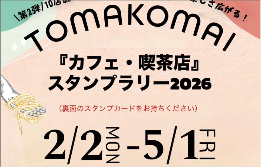 【免責事項】当Webサイトに掲載しているスタンプラリー情報は主催者の提供する情報をもとにしており、当協会において内容を保証するものではございません。掲載内容の不備による損害等については責任を負いかねます。また当Webサイトに掲載の情報やURLは予告なしに変更または中止されることがあります。「苫小牧喫茶店スタンプラリー2026」に関するお問い合わせは、当協会ではなく開催団体までお願いいたします。