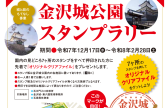 12月17日(水)~2月28日(土)の期間中、金沢城公園にて「金沢城公園スタンプラリー」が今年も開催されます。園内の見どころ7ヶ…